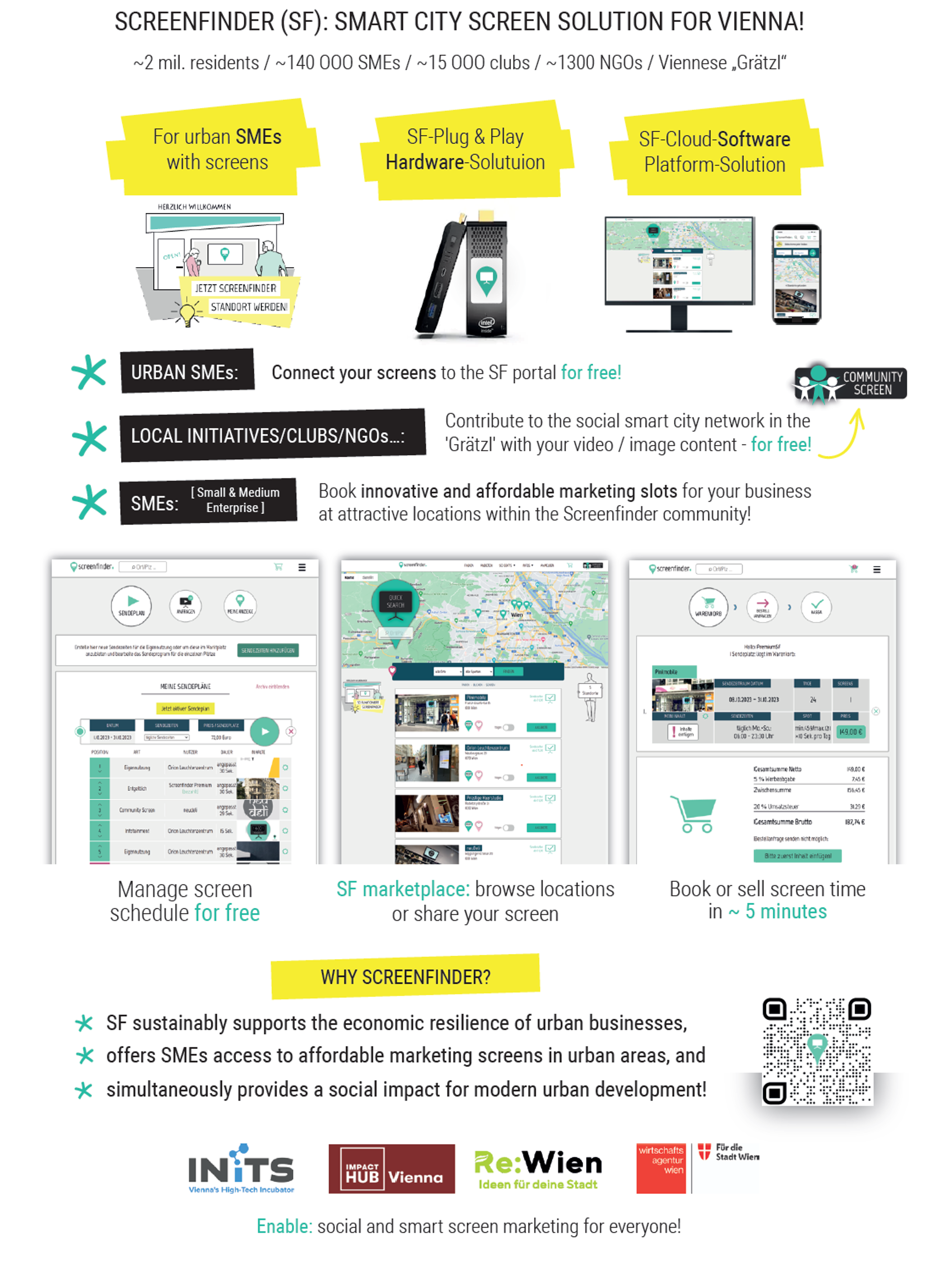 Screenfinder bietet in der österreichischen Medien- und Marketingbranche eine völlig neue Art der Nutzung von Bildschirmsystemen mit Hilfe des Internets: Marketing- Informations- und Infotainment-Inhalte können einfach, schnell und kostengünstig auf Bildschirmen in der Umgebung gesendet werden – mit geringem Aufwand und nahezu vollautomatisch. Das Screenfinder Online-Portal bietet eine Plattform, die zwischen Bildschirmbetreibern, die Sendezeiten auf ihren eigenen Bildschirmen anbieten und Personen, die Inhalte senden möchten, vermittelt.