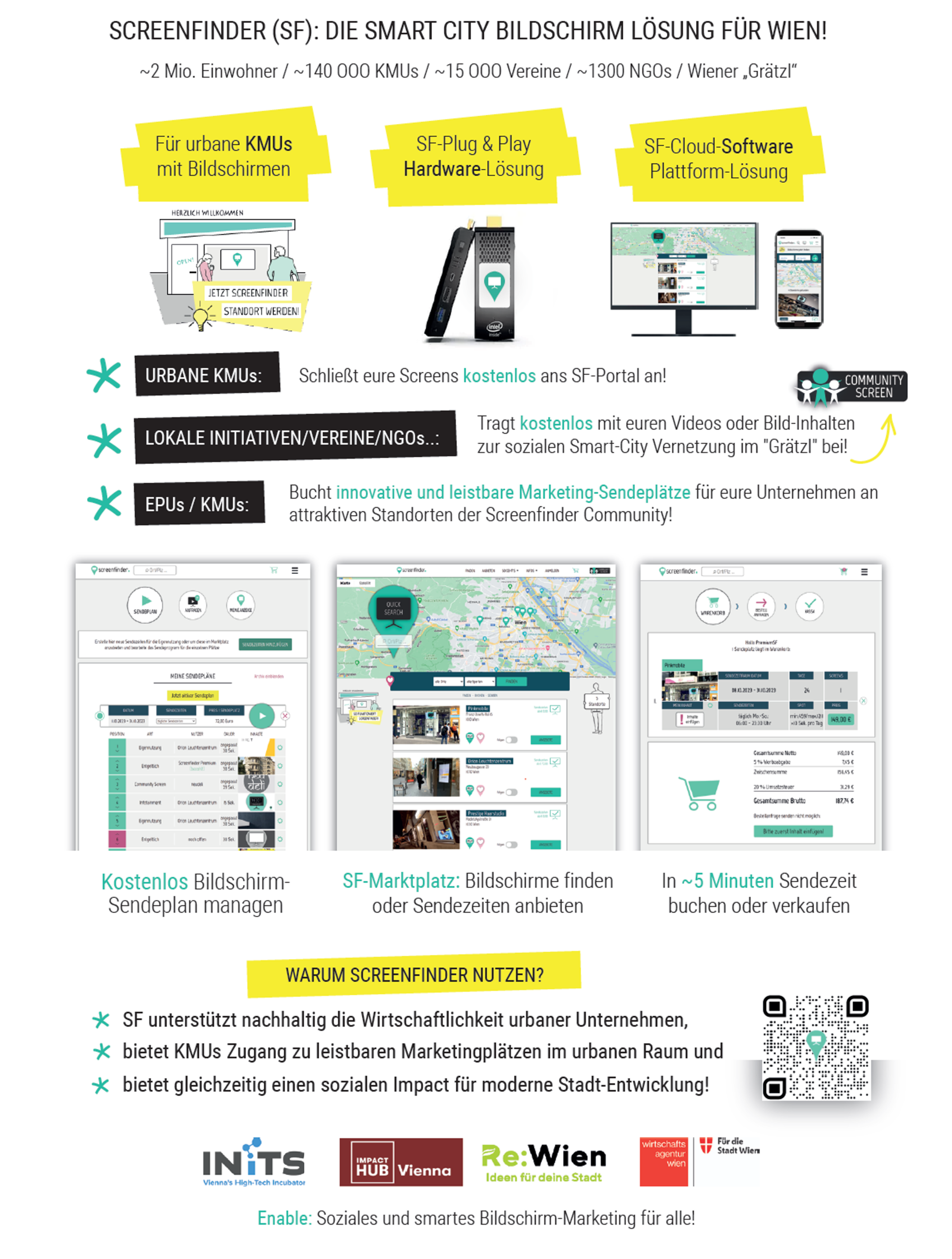 Screenfinder bietet in der österreichischen Medien- und Marketingbranche eine völlig neue Art der Nutzung von Bildschirmsystemen mit Hilfe des Internets: Marketing- Informations- und Infotainment-Inhalte können einfach, schnell und kostengünstig auf Bildschirmen in der Umgebung gesendet werden – mit geringem Aufwand und nahezu vollautomatisch. Das Screenfinder Online-Portal bietet eine Plattform, die zwischen Bildschirmbetreibern, die Sendezeiten auf ihren eigenen Bildschirmen anbieten und Personen, die Inhalte senden möchten, vermittelt.